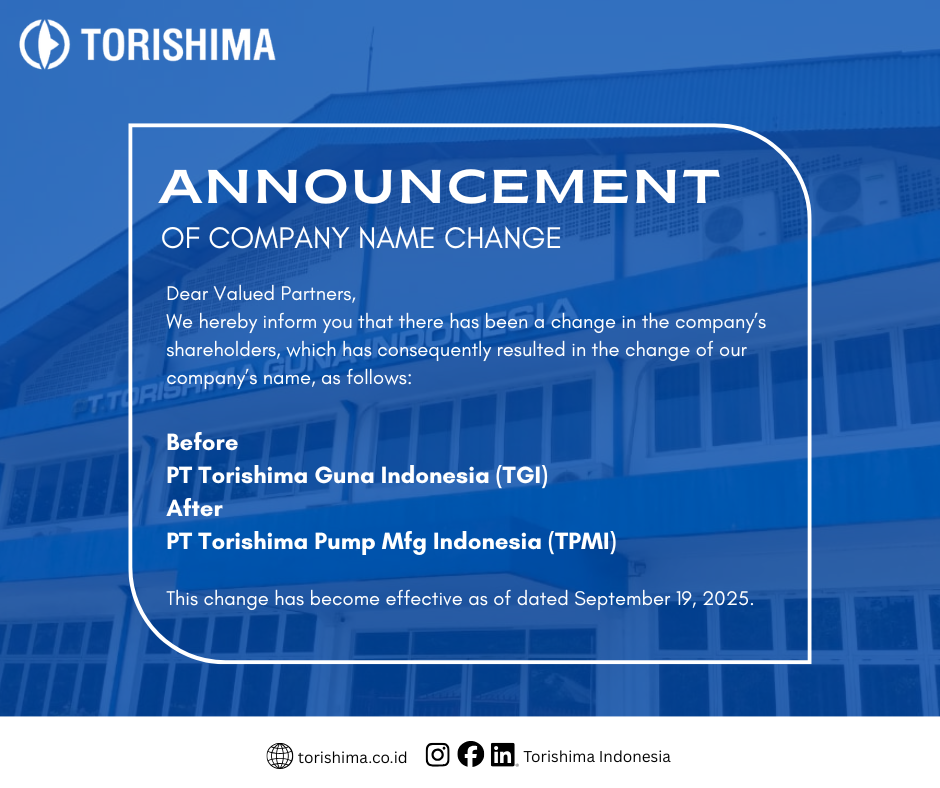 PT Torishima Guna Indonesia adalah perusahaan patungan Indonesia antara Torishima Pump Mfg. Co. Ltd. Jepang dan PT Guna Elektro Indonesia. PT Torishima Guna Indonesia sangat bangga diakui secara luas sebagai produsen pompa yang andal. Dengan menggunakan fasilitas manufaktur termutakhir, PT Torishima Guna Indonesia mampu memproduksi jajaran produk pompa industri kelas dunia termasuk end suction, multi-stage high pressure, split casing , booster set dan set pompa lainnya. Dengan kelengkapan produksi mulai dari proses pengecoran di group kami sendiri hinggaproses akhir pembuatan pompa, kami memiliki kontrol total terhadap kualitas produk.